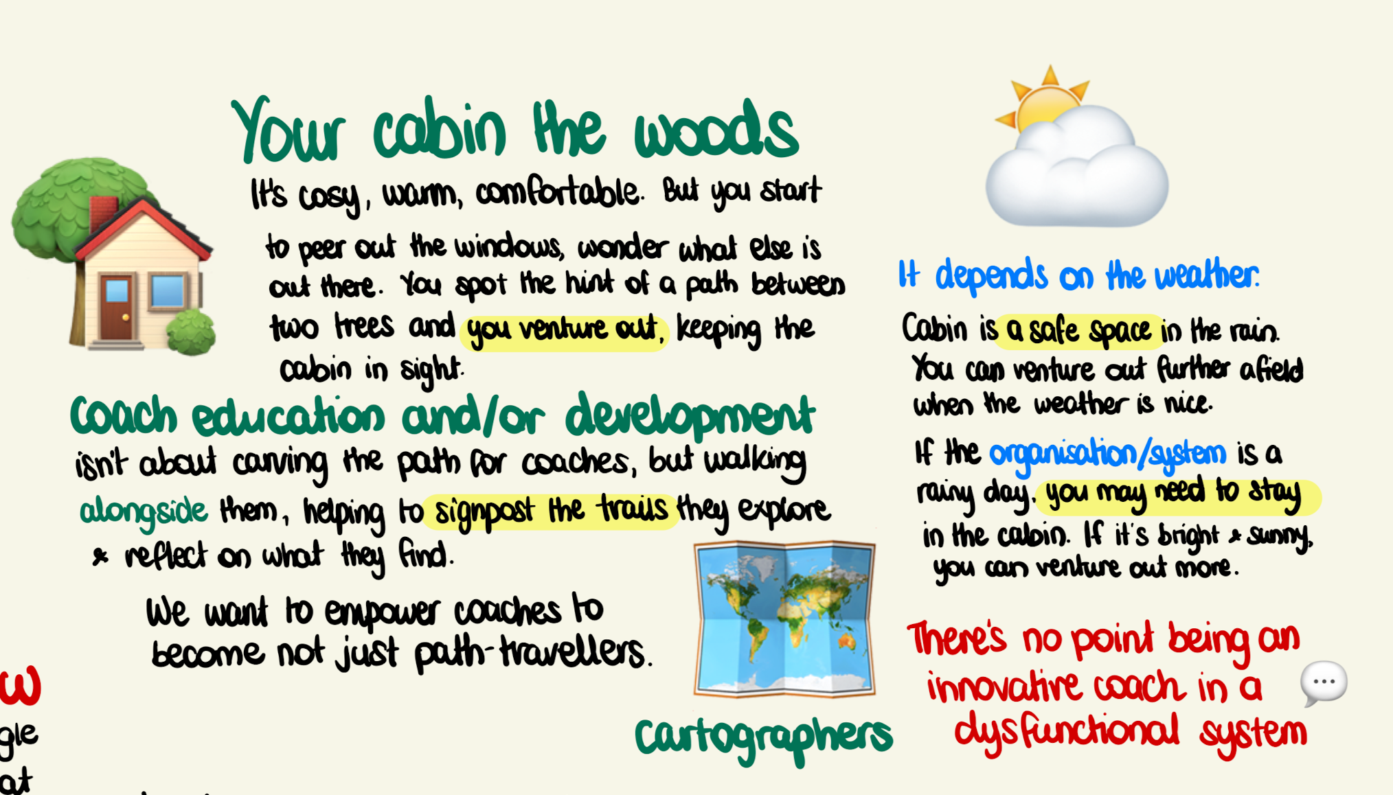 In the open discussion after my short presentation, we continued to explore the metaphor! I was reminded of the many other systems at play around the cabin, zooming out to consider the person and environment interacting simultaneously. For many coaches, there is systemic pressure on their coaching that makes venturing out difficult, and this was discussed as a weather system.